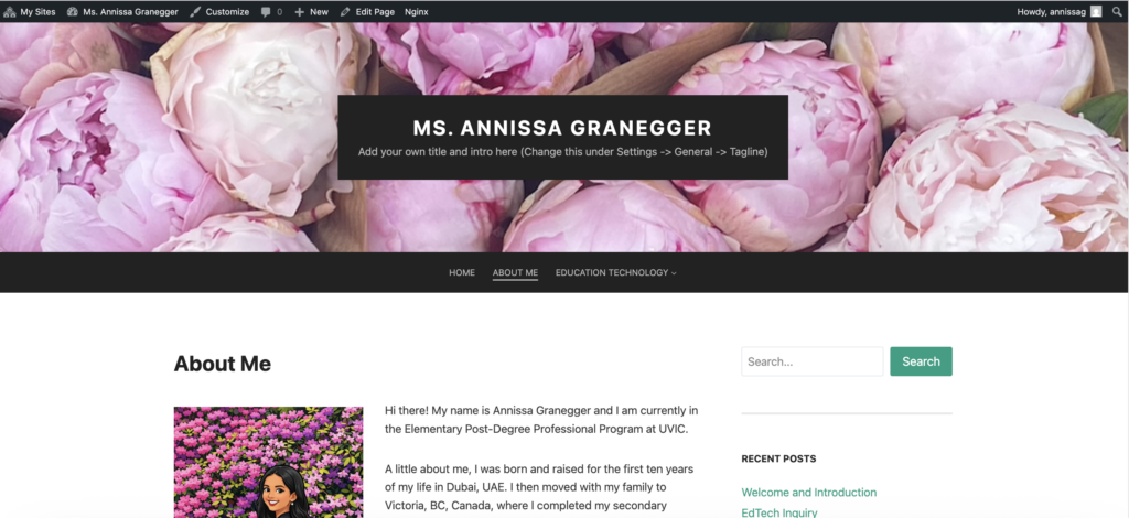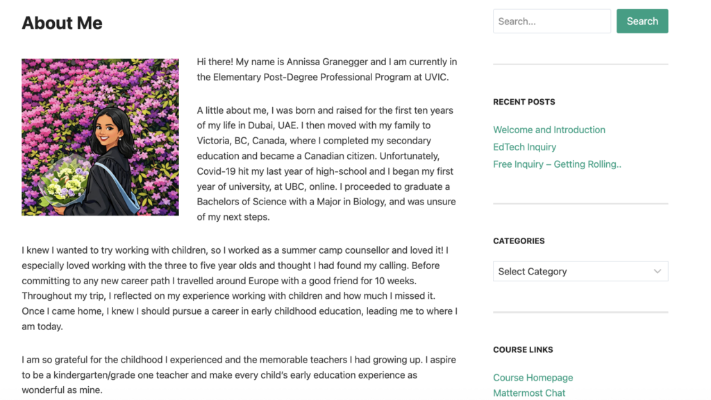 After class, I created my blog on WordPress and familiarized myself with the layout and tools. I changed the background photo of the title of my blog to better suit me and I added to my About Me page. Using AI, I was able to cartoon a picture of myself and upload it to my page. I wrote about my background and desires, which I found challenging because I didn’t know how much to share publicly. I am slowly becoming more comfortable on here and excited to see how my blog takes shape during this course.